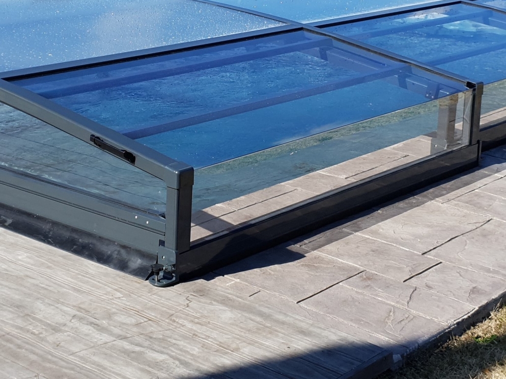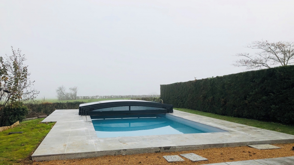 La structure mobile télescopique de l’abri de piscine bas est harmonieuse et cossue.