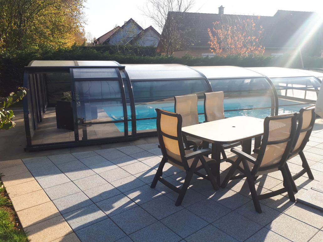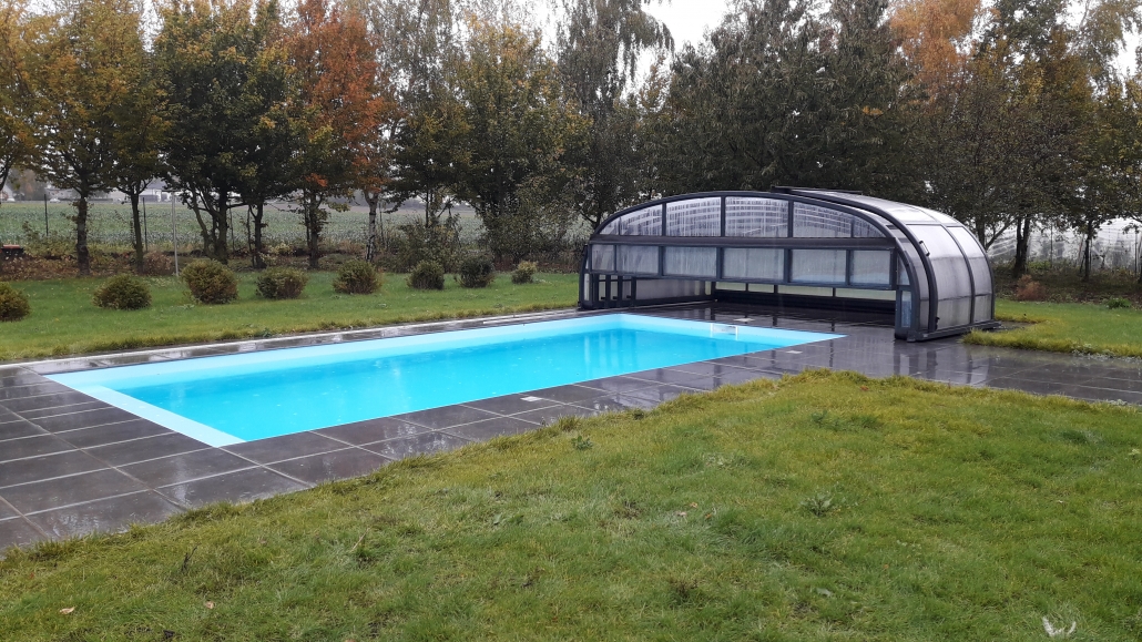 L’abri de piscine possède des lignes fluides et douces, sans usinage apparent.