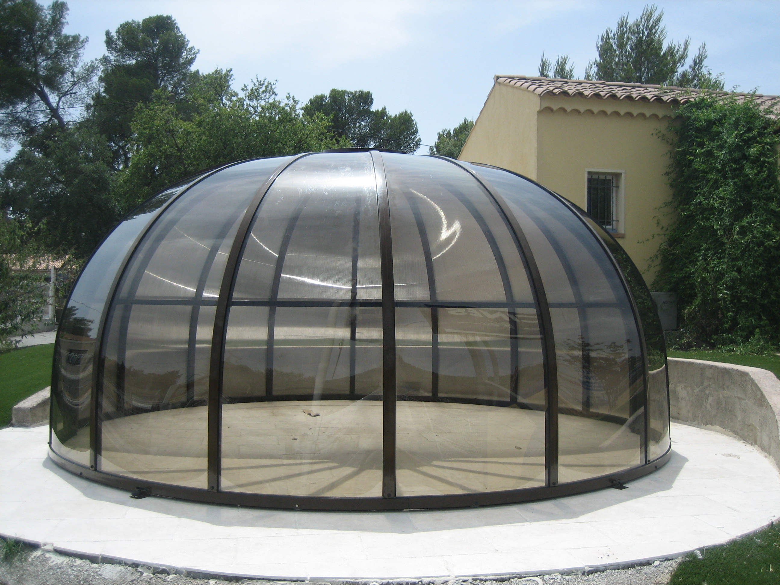 L’abri est composé de 2 parties dont 1 mobile sans rail au sol, composé d’une structure aluminium teinte gris RAL 7042 ou marron RAL 8014.
