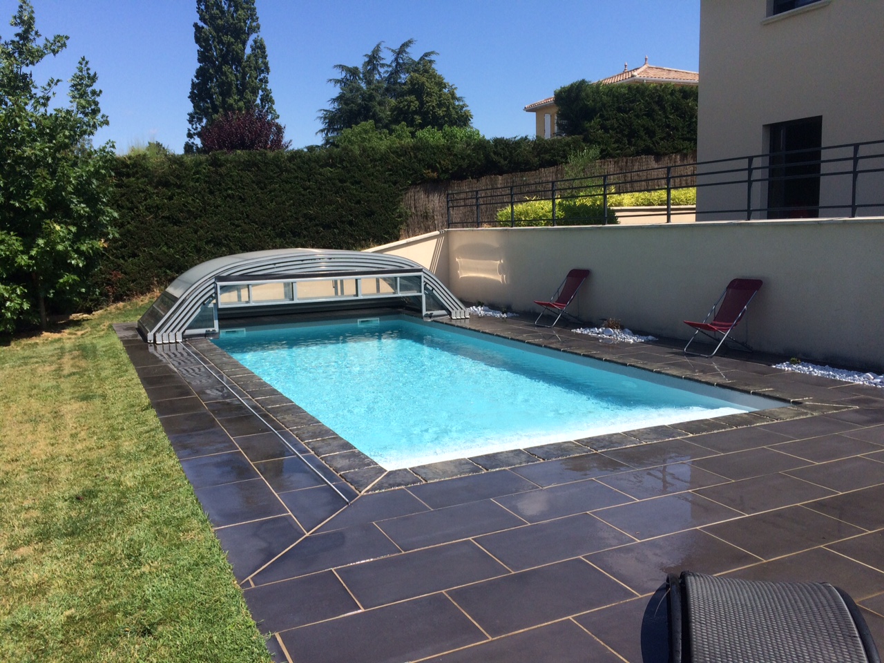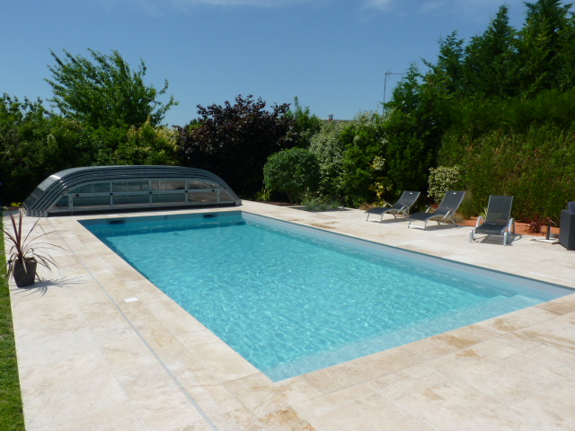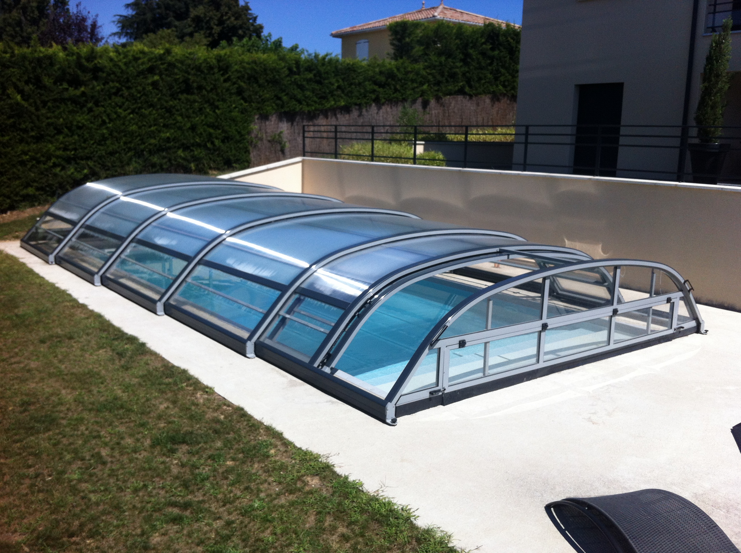 ELITYS MIANSO est un abri de piscine bas télescopique qui allie le mieux esthétisme et confort.